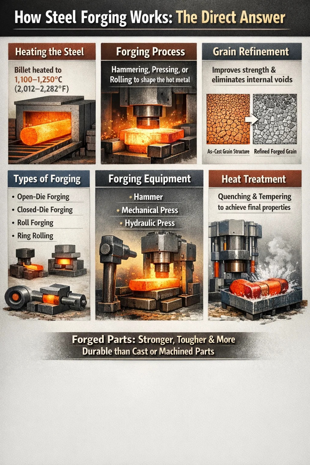 I dtéarmaí praiticiúla, téitear billéad cruach nó tinne idir eatarthu 1,100°C agus 1,250°C (2,012°F go 2,282°F) le haghaidh gaibhnithe te — an modh tionsclaíoch is coitianta — ansin é a chur faoi phreas nó casúr a dhífhoirmíonn sé isteach sa chruth atá ag teastáil. Ansin déantar an chuid múnlaithe a fhuaraithe faoi choinníollacha rialaithe agus críochnaithe trí mheaisínithe, cóireáil teasa, nó próiseáil dromchla.
