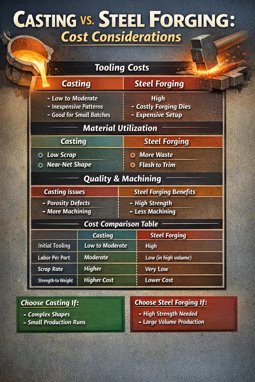 Sa ghearrthéarma agus le haghaidh táirgeadh simplí ard-toirte de chruthanna casta, tá réitigh níos saoire go ginearálta maidir le praghas aonaid tosaigh. Mar sin féin, brionnú cruach go minic go gcruthóidh sé níos eacnamaí thar an bhfadtéarma do chodanna a dteastaíonn ard-neart, lochtanna íosta, agus saol seirbhíse fada. Braitheann an rogha "is saoire" go hiomlán toirt táirgeachta, castacht céimseata, agus riachtanais meaisínithe tánaisteacha.